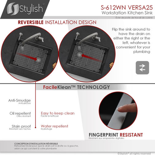 STYLISH 25'' VERSA25 S-612WN Graphite Black Workstation Single Bowl Kitchen Sink